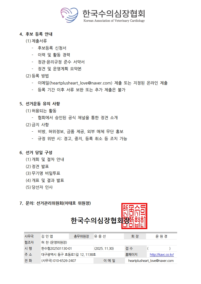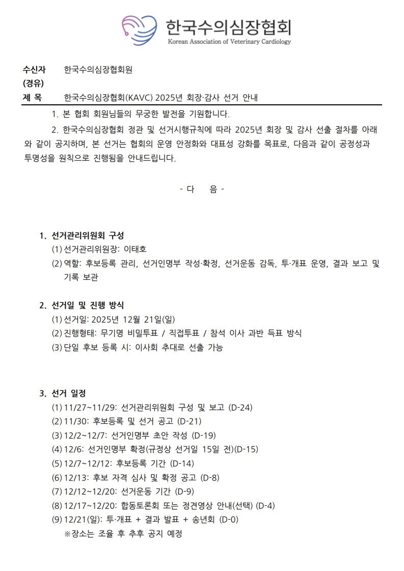 한국수의심장협회(KAVC) 2025년 회장, 감사 선거 안내
